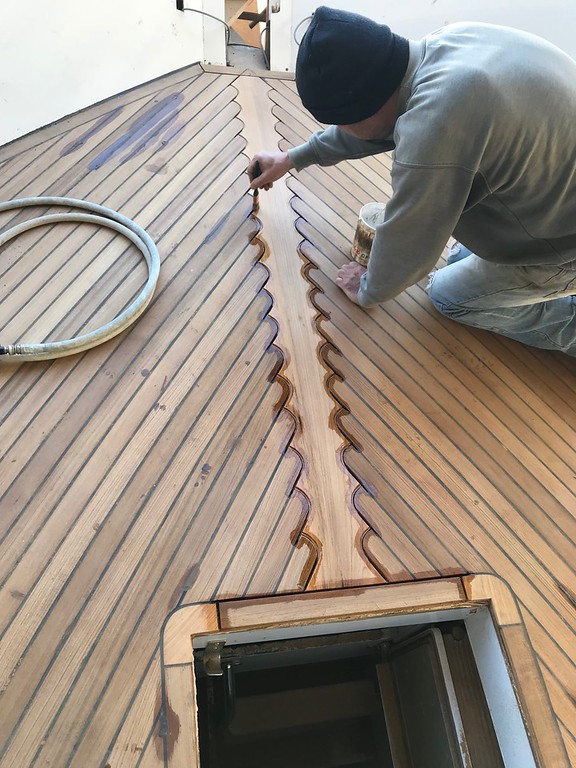 2) The teak caulking grooves were made on each individual plank, with a machine, before the planks were placed in position,