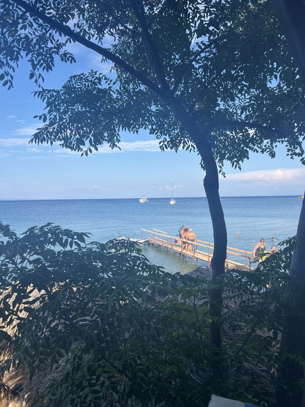 Next stage of the journey was a short chug up to the top of the inlet about 6 or so NM which has great reviews on Navily. We spent a night there under the white cliffs which is a lovely sheltered anchorage. While the water looks less inviting as it is green this is just the weed on mud. For anyone who goes there is a great Taverna called Three Umbrellas. Easy to find, just take the tender towards the three loungers and sun umbrellas that are sitting in the water. What is slightly different is that the water shallows out about 200m from the shore which means that you need to anchor the tender in most cases and wade ashore. Pedro the taverna owner is quite a character.