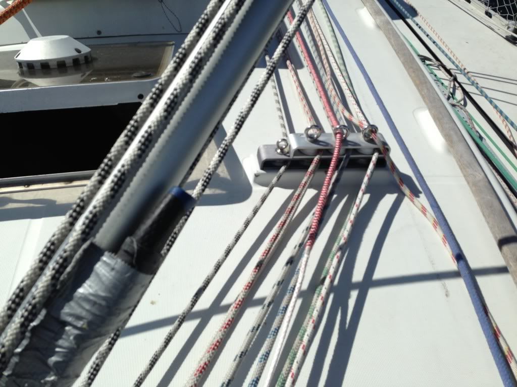 No, no.... my original layout was for a furling main. All halliards led aft. The re-rig and switch to conventional main is what's caused the problem. The original Beneteau conventional main layout had single line reefing for reefs 1 & 2 - I don't like single line reefing (experience has shown it can be difficult to get the reef in properly when the gear is other than brand new) so I've used 4 lines for the reefs rather than two. The halyard is plenty long enough - it's just the absence of deck hardware and clutches at the cockpit that's caused the halliard to stay at the mast.