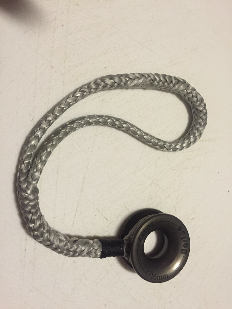 (Alternatively I could use the existing car-mounted block at the aft end of the track, and find another way of bolting the dyneema eye to the forward end of the track.)