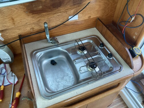 - Replace the sink / hob with a modern one. Get rid of the awful wooden lid and replace the worktop.