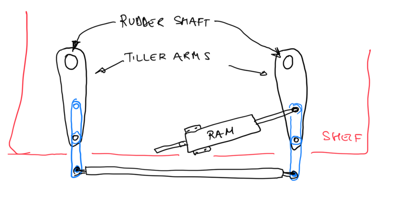 this drawing might explain what I had in mind with that specially shaped rudder connection rod, and the possibility to slightly move the hydraulic ram; more forward,