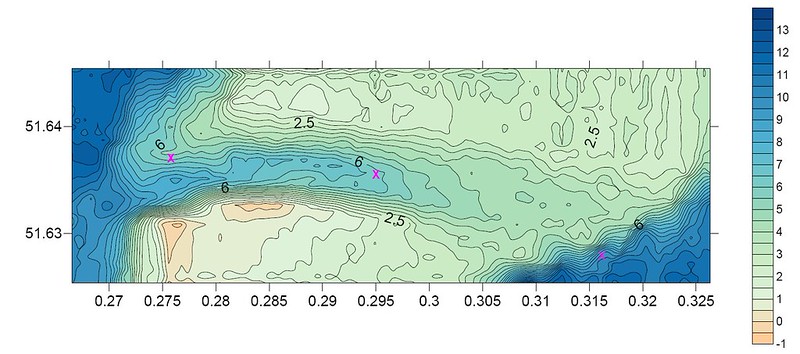 As a general observation, the shape of the swatch is as before. 6 metres or more in the west side but from the midpoint it reduces from 5 metres to largely 4 metres. The shallowest part right at the eastern end of the swatch but you will still find 3.8 metres. But it is clear the swatch has migrated slightly to the north-east. The consequence of that is that although if you were on the rhumb line exactly between the west waypoint to the mid-waypoint you could find the (very steep - no - very very steep!) southern knoll drying 0.8 metres (if the tide were out) only 200 metres away! The width of the swatch has been maintained - just moved a little. So I have recommended three new waypoints and I would recommend that, at low water, sticking to the West to Mid part of the Rhumb line is a good idea.