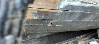 The first of the many odd repairs done to the transom. The transom covered up the end grain of the planks with a thin layer of plywood
