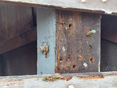 The steering turning blockwhich is bolted through the planking, originally with eight bolts, However, there are only five remaining in position. There will be eight fitted back when this block is replaced and when the hull is re-planked.